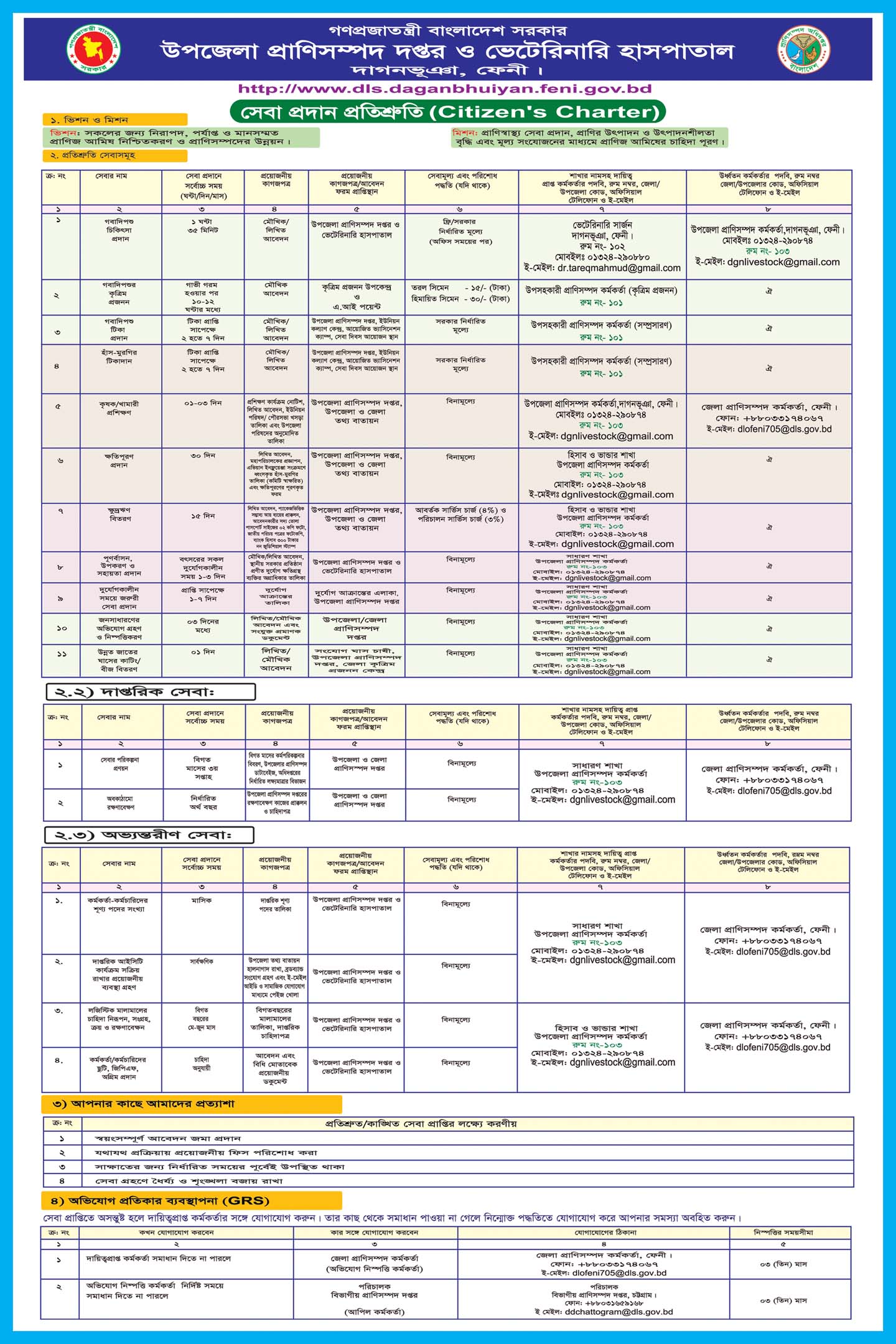 ১ | অসুস্থ গবাদি প্রানী ও হাঁস-মুরগীর চিকিৎসা ও ব্যবস্থাপত্র প্রদান: ক) হাসপাতালে খ) কৃষকের বাড়ী/ খামারে/ চেম্বারে গ) গবাদি প্রানী ও হাঁস-মুরগীর নমুনা (গোবর, রক্ত ও অনান্য নমুনা) পরীক্ষাকরা ও প্রয়োজনে এফ.ডি.আই.এল প্রেরন করা। |